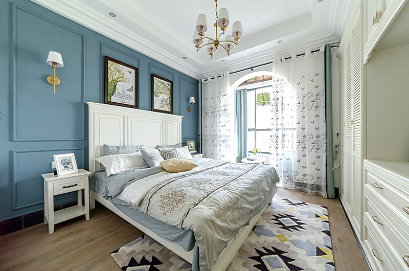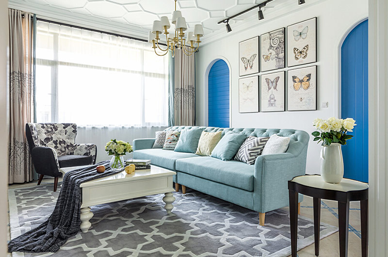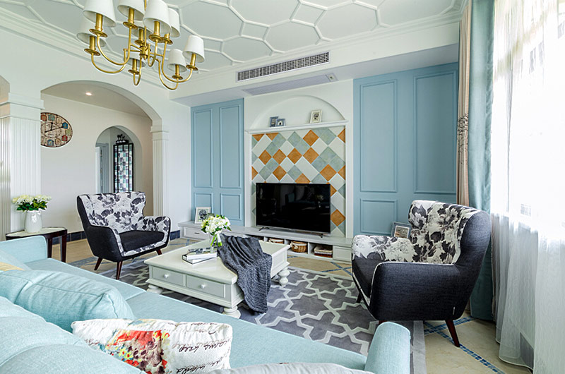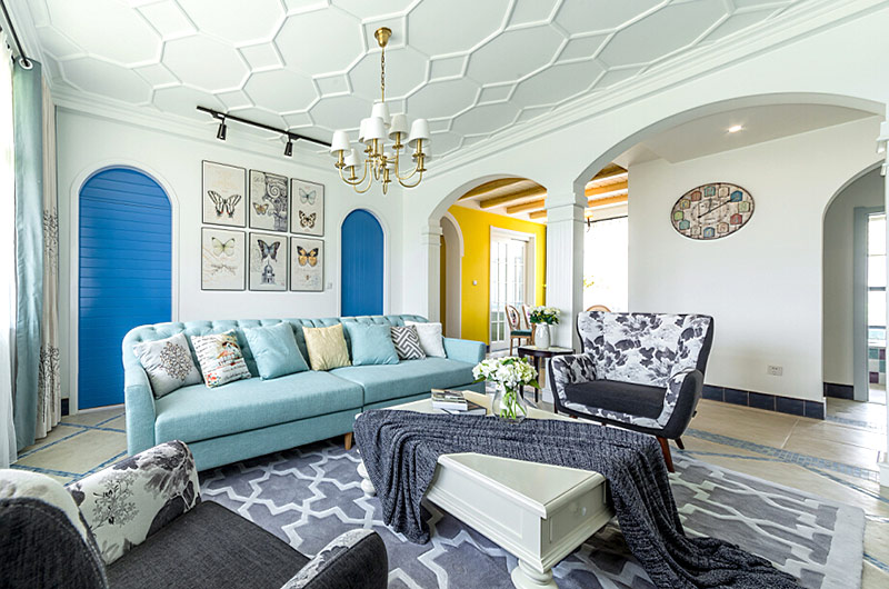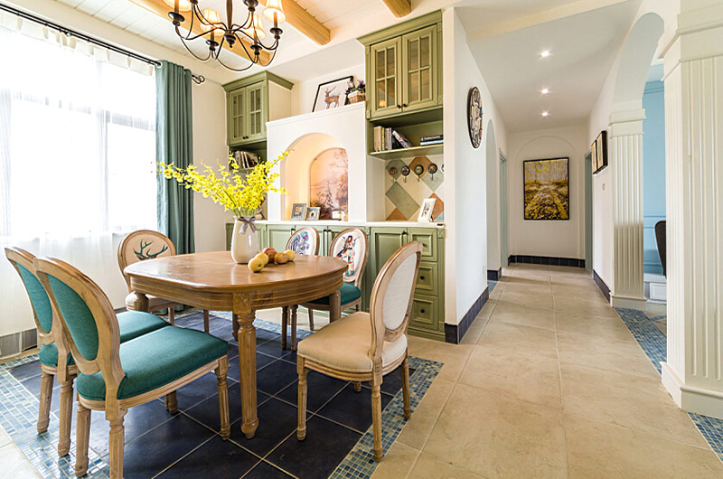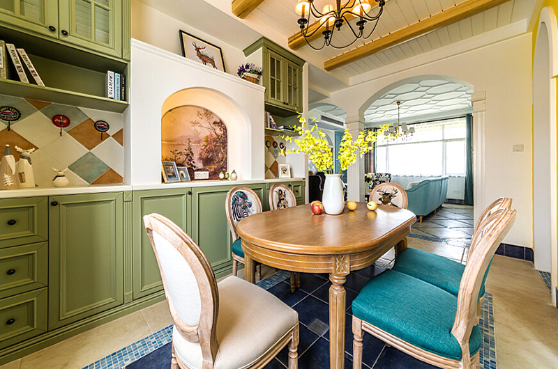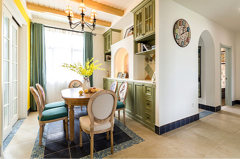 本案中的130平米的三居室整體采用了地中海風(fēng)格裝修,并在清爽愜意的空間氛圍中融入了田園風(fēng)格的清新自然感,在色彩的選擇上也盡量的以清爽的藍色和富有活力的明黃色為主,并在餐廳中運用了象征著森林的墨綠色,為空間帶來靜謐之感的同時也增添了幾分自然的氣息。