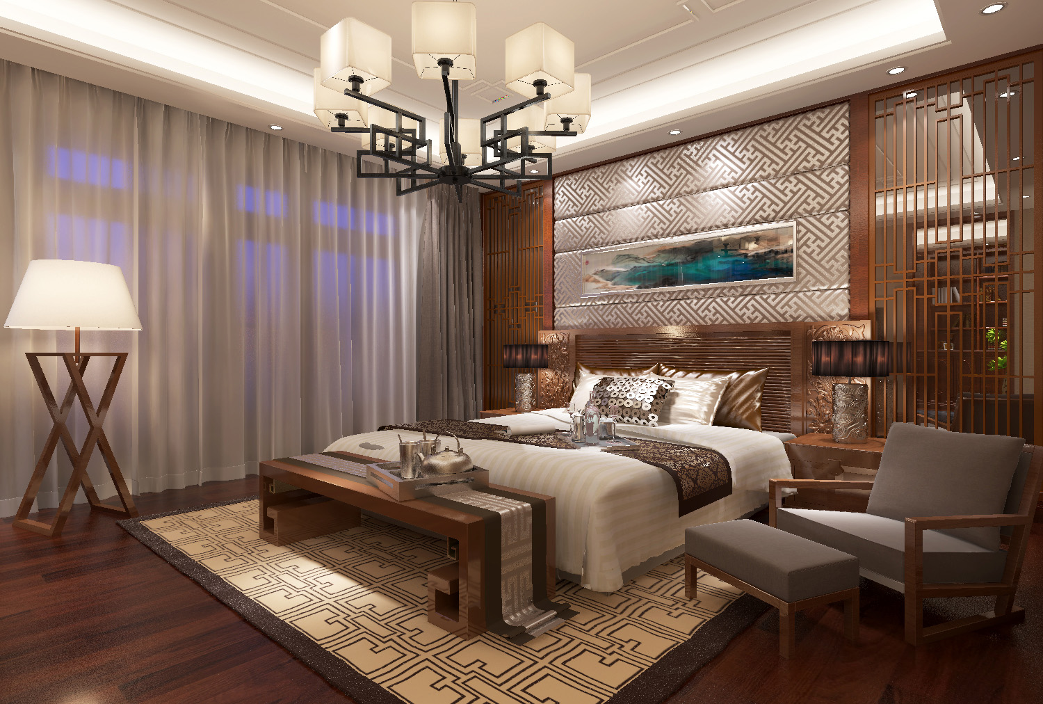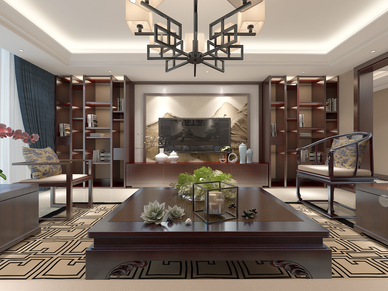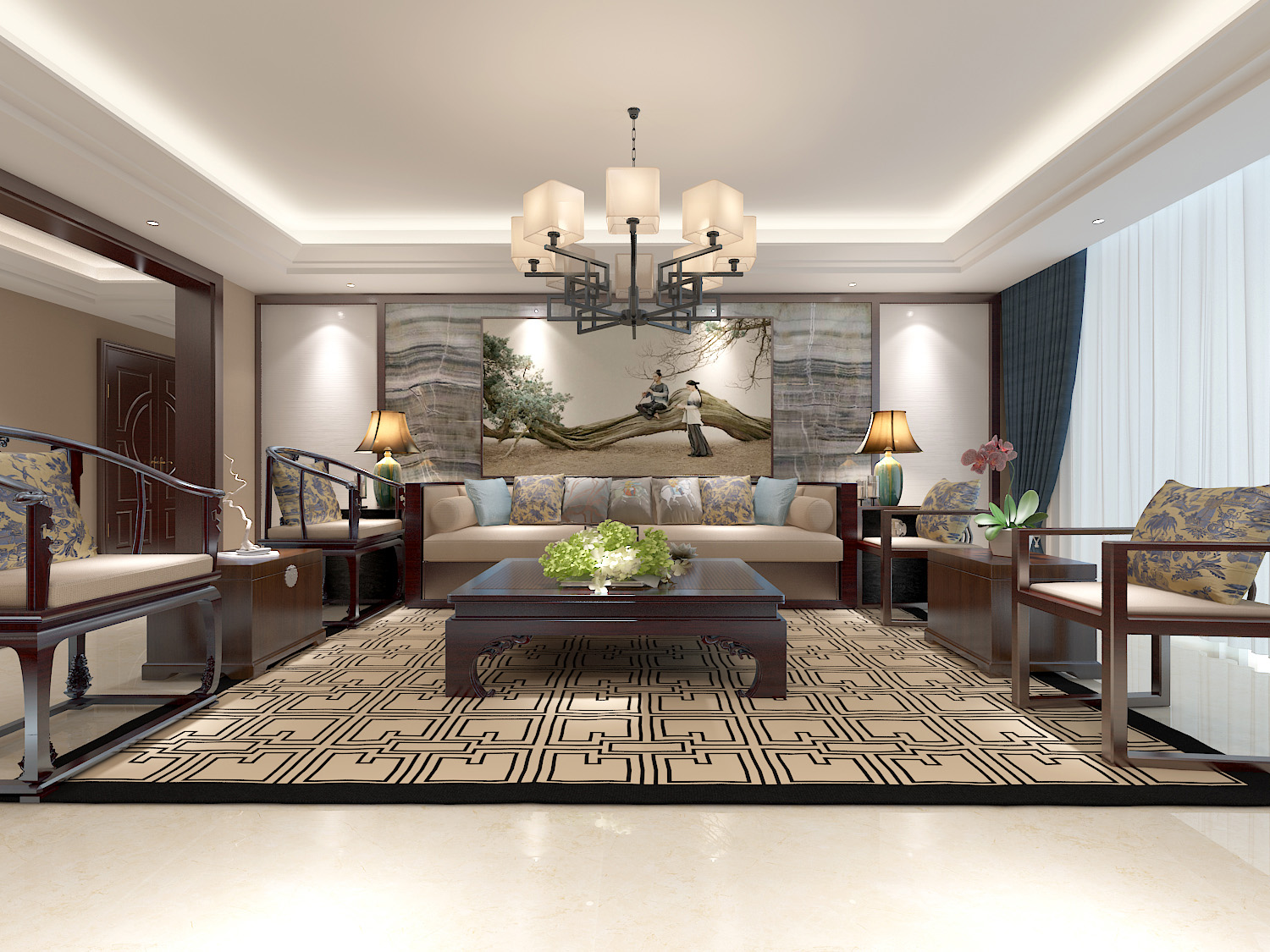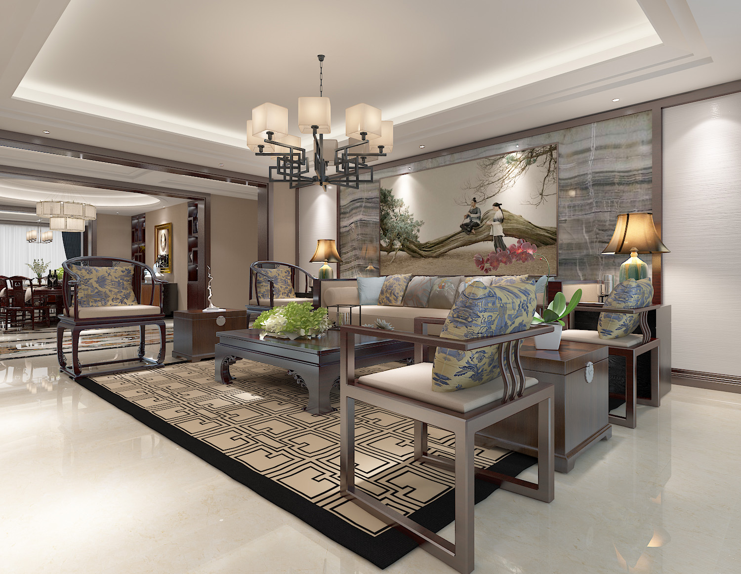本案中的360平米的三居室整體采用了新中式風(fēng)格裝修,新中式風(fēng)格的設(shè)計(jì)不拘泥于傳統(tǒng)的中式元素,而是在繼承古典的基礎(chǔ)上融入現(xiàn)代的特色,將兩者有機(jī)地統(tǒng)一起來(lái),作品表達(dá)出現(xiàn)代人對(duì)于中式風(fēng)格低調(diào)沉穩(wěn)的精神境界的追求。