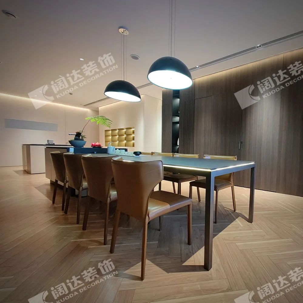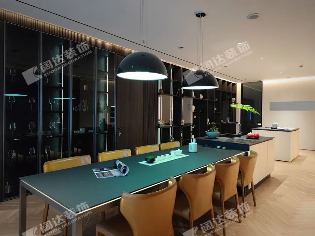 社交洽談區(qū)域采用當(dāng)代最流行的膚感飾面制作一體化島臺(tái)桌面,既提升品質(zhì),又有觸碰島臺(tái)桌面時(shí)的舒適感,在餐桌的前后分別有大面積的玻璃酒柜和可封閉式西廚操作臺(tái),桌面邊上采用軌道插座,實(shí)用的設(shè)計(jì),滿足了用餐和辦公的雙重需求。