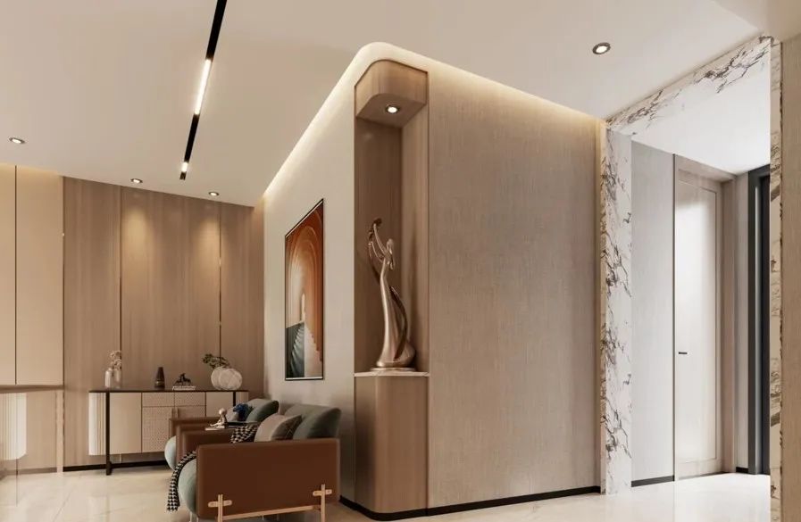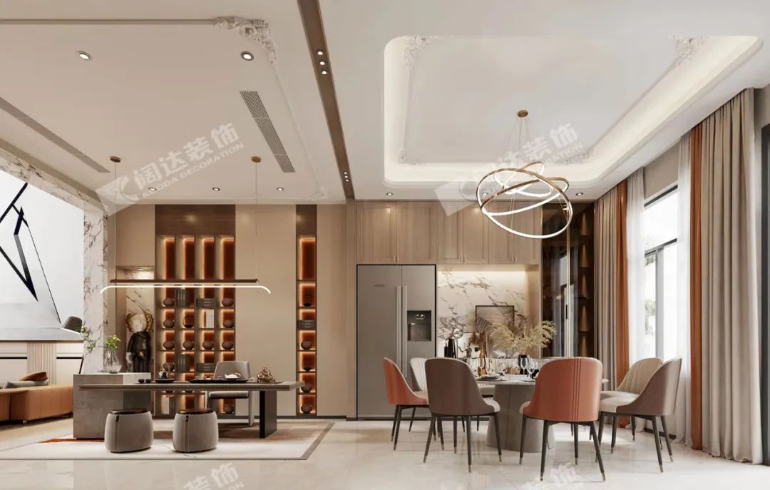 客廳:溫暖明亮,經(jīng)濟耐看是本案的主要需求之一,剔除了法式復(fù)雜的線形后,融入了現(xiàn)代溫暖明亮的暖色系風格,材質(zhì)上搭配巖板,給予了視覺上的沖擊力,成為業(yè)主期待的理想之家。