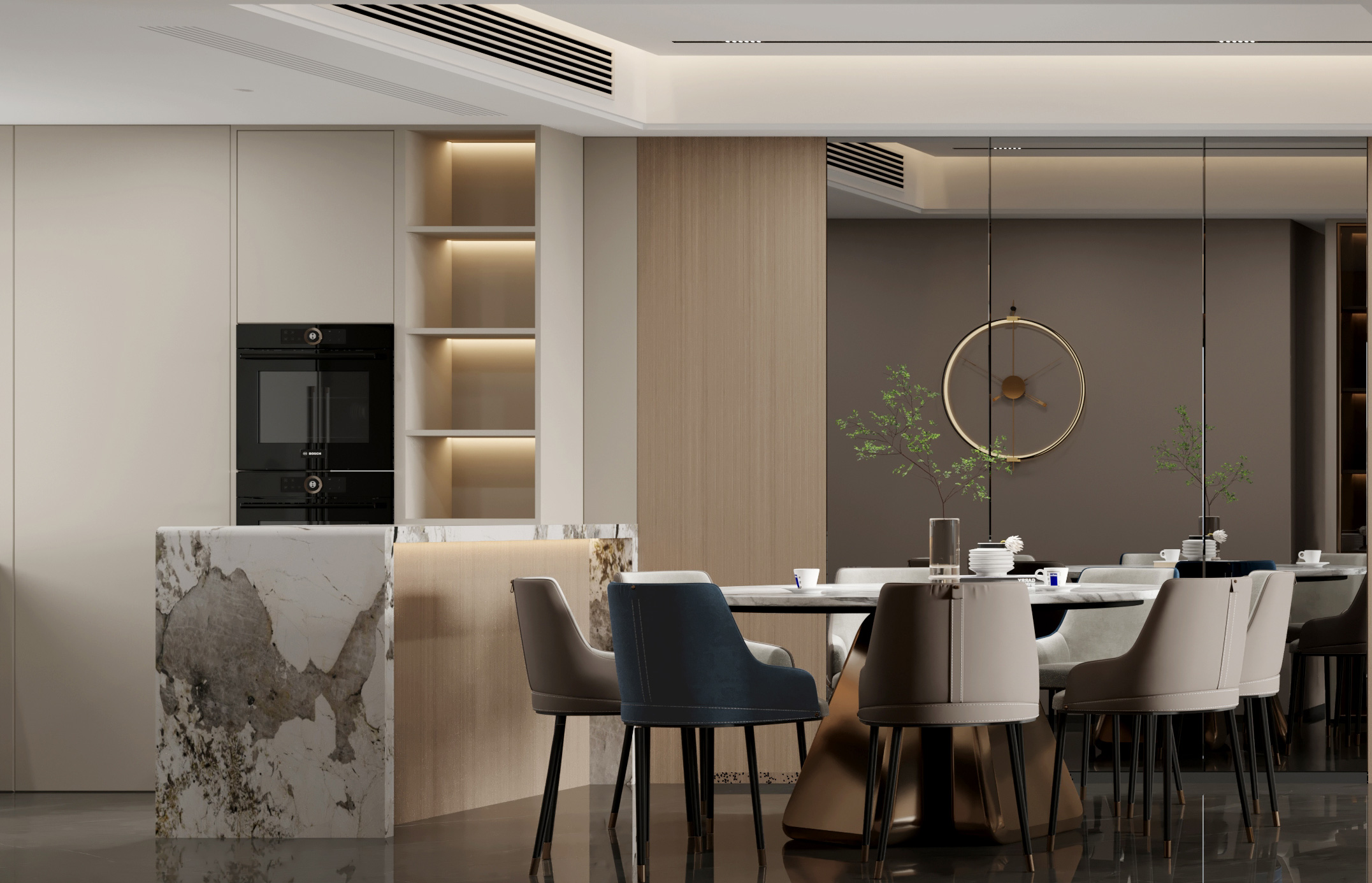 著重用空間處理的設計手法,來強調(diào)空間的靈活分割,以追求設計的幾何性和秩序感,空間線條簡約、流暢。