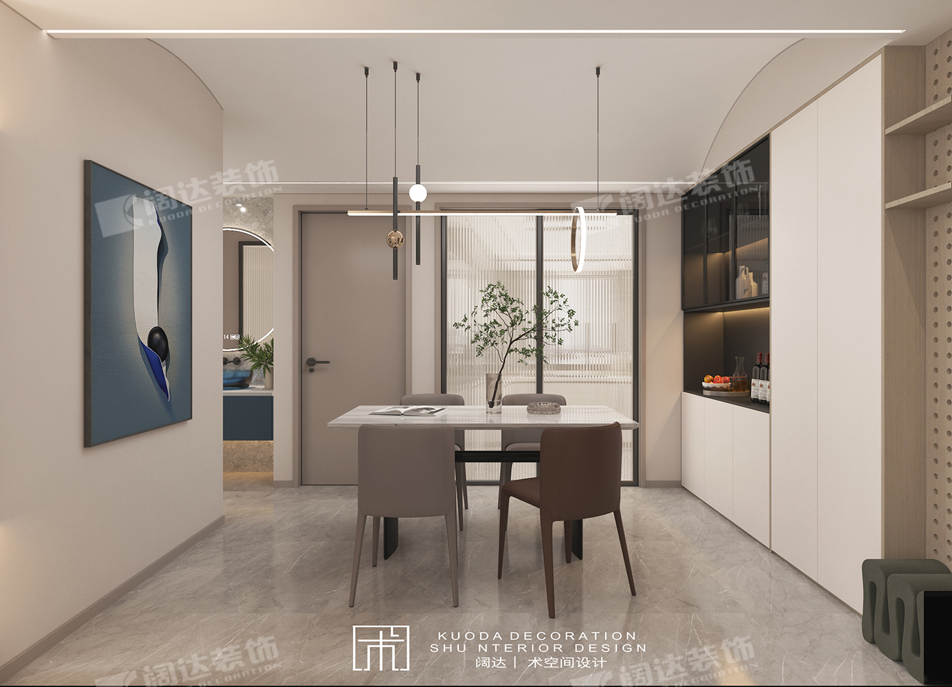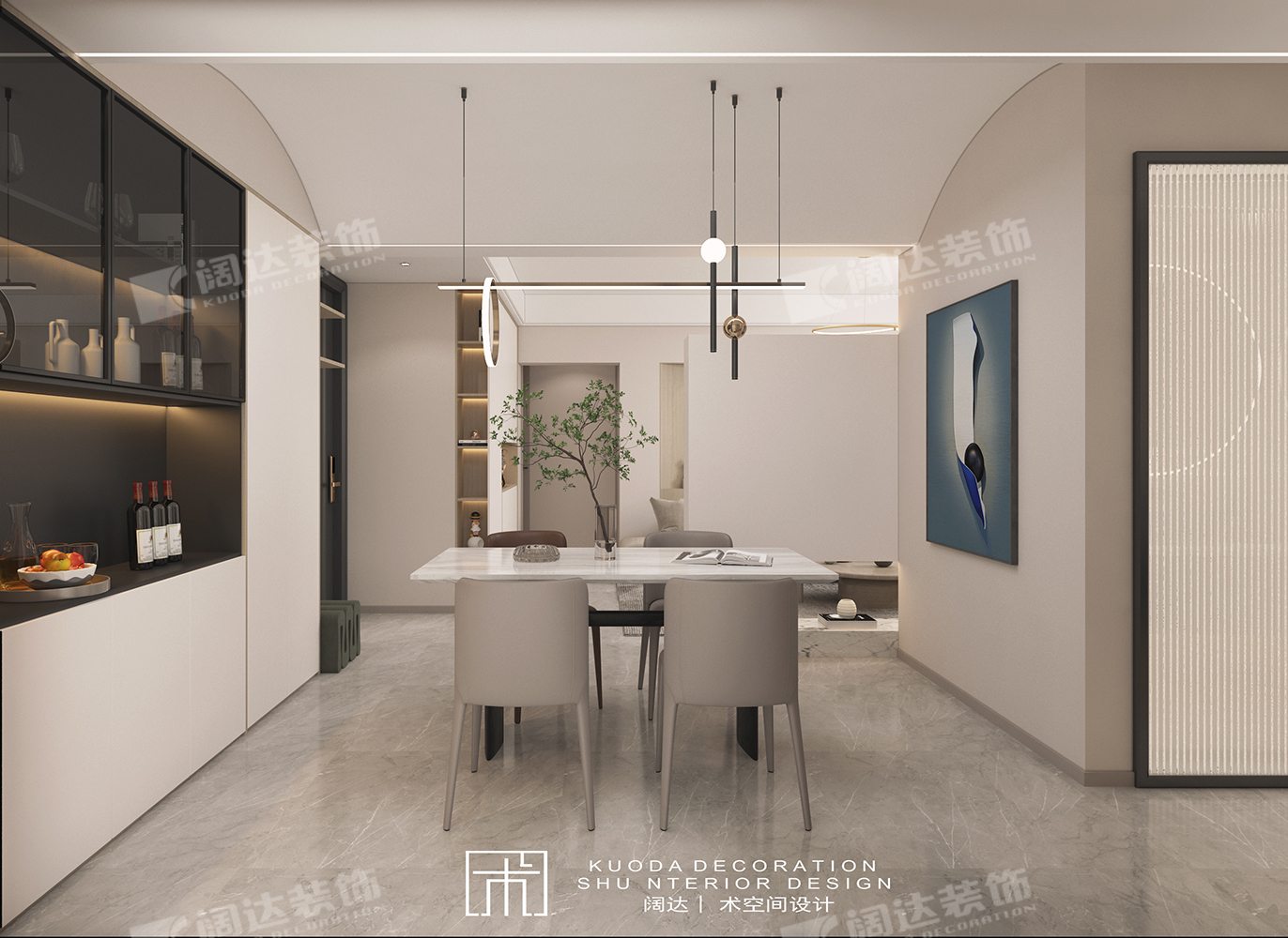 綜合以上調(diào)整結合業(yè)主需求,設計師又將陽臺墻體拆除換成移門,整體基調(diào)簡約為主,餐廳采用弧形頂設計,輔以線性燈照明,既適當放大層高,又烘托了就餐氛圍。