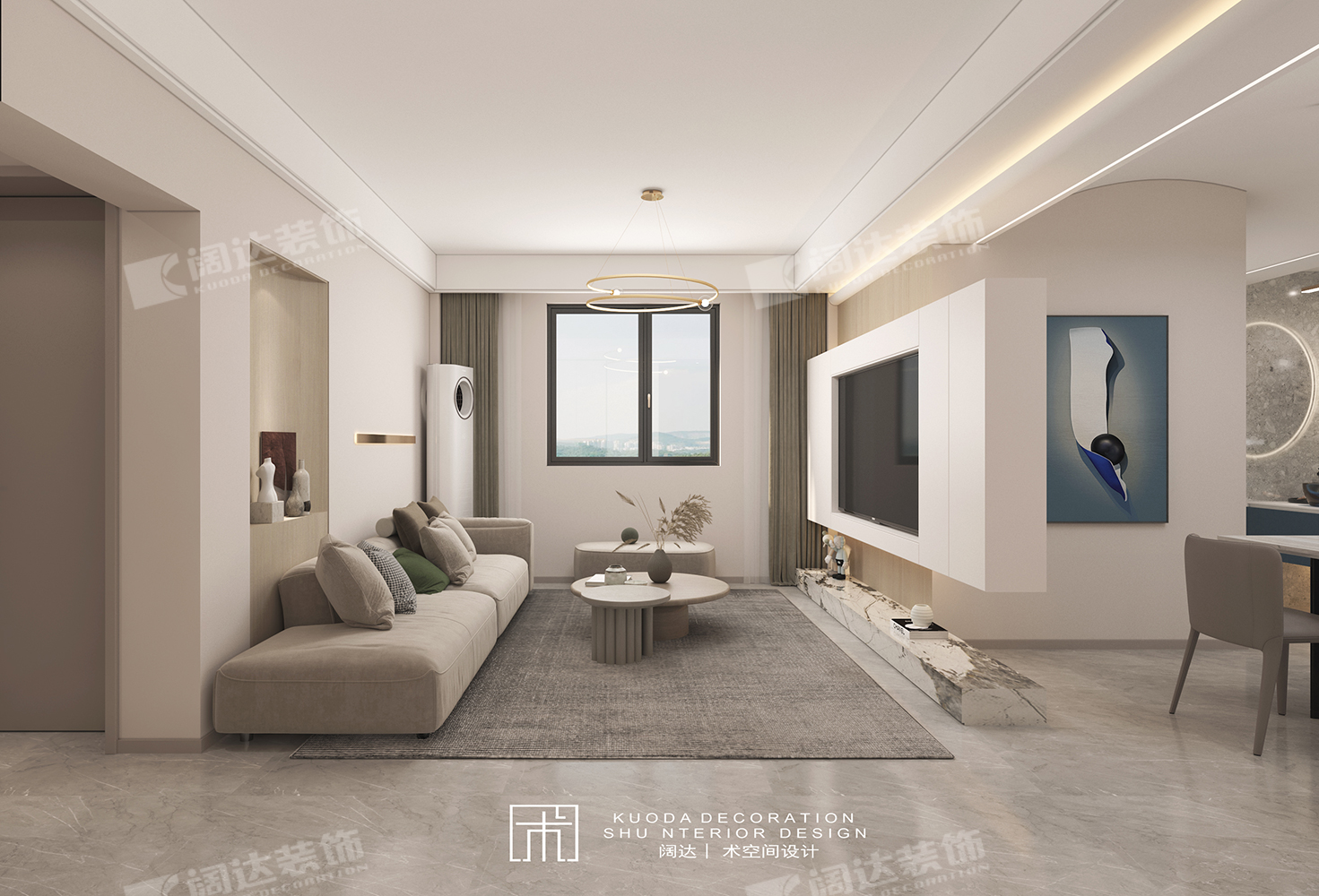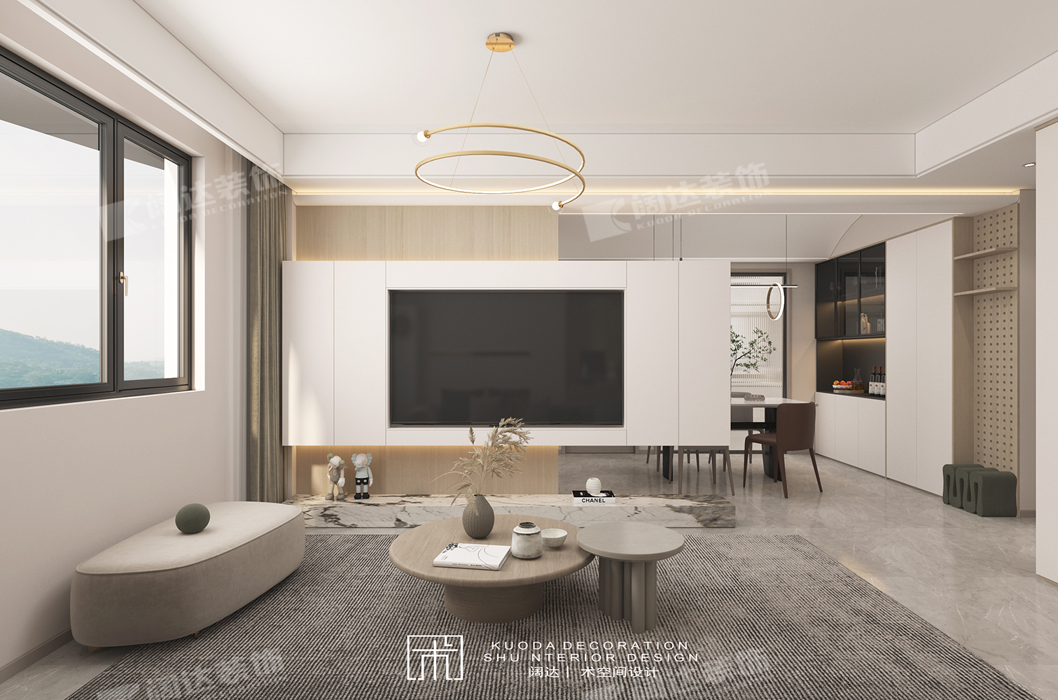 通過改變臥室門方向,延長了客廳墻面,正好將沙發(fā)由南朝北放置于此,對面電視背景做懸空處理,將光線引入餐廳,整個區(qū)域采光、動線和比例較為適宜。