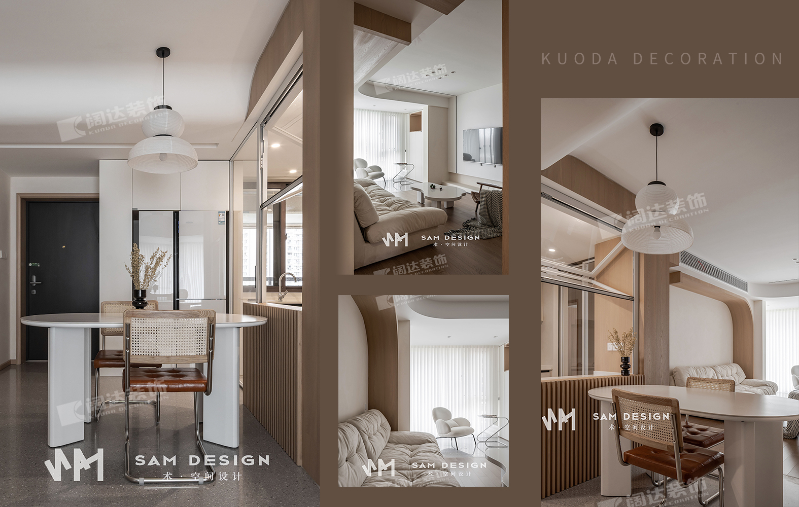核心亮點(diǎn):打破空間限制,將客廳、餐廳、廚房融為一體,提升了空間美感及社交趣味。