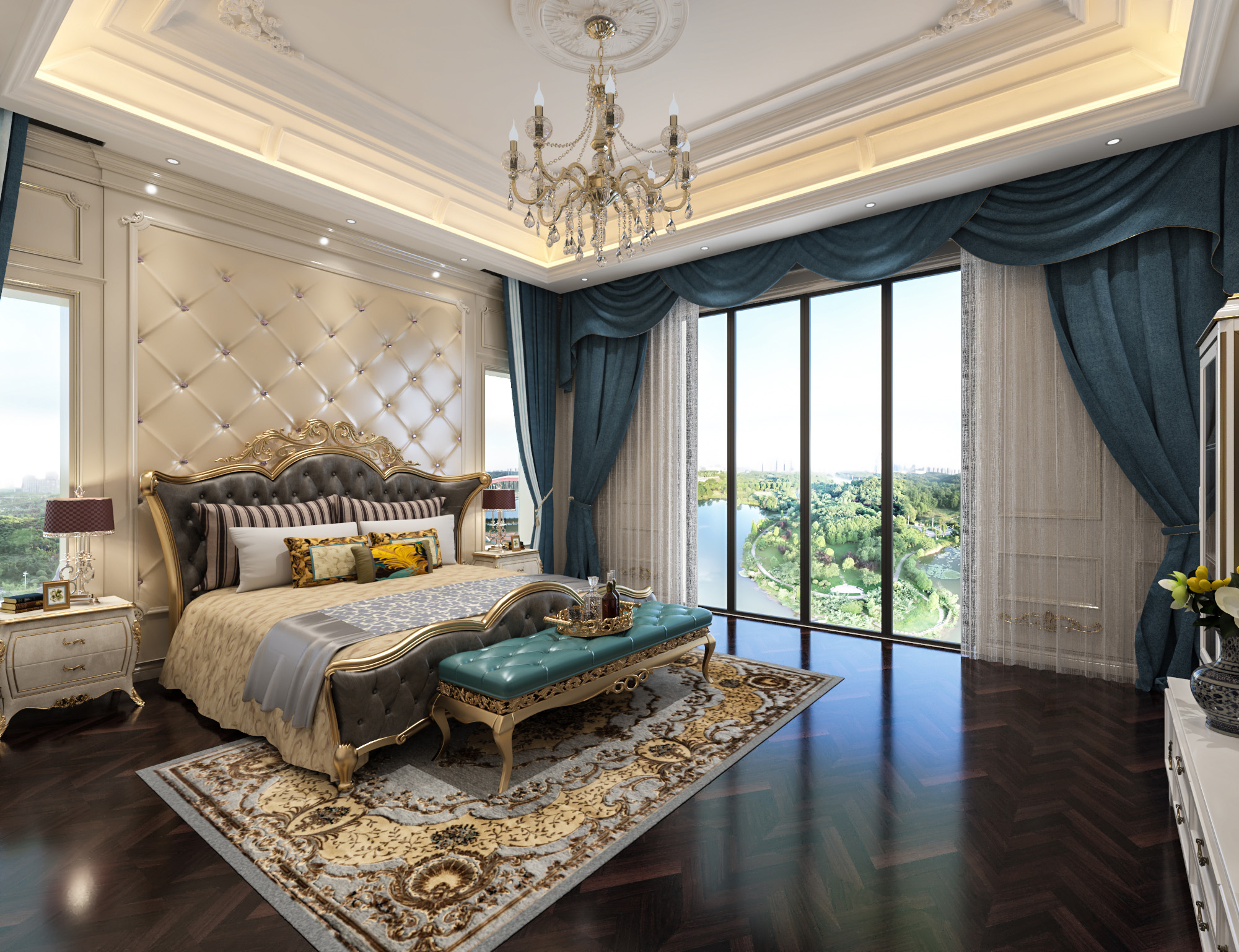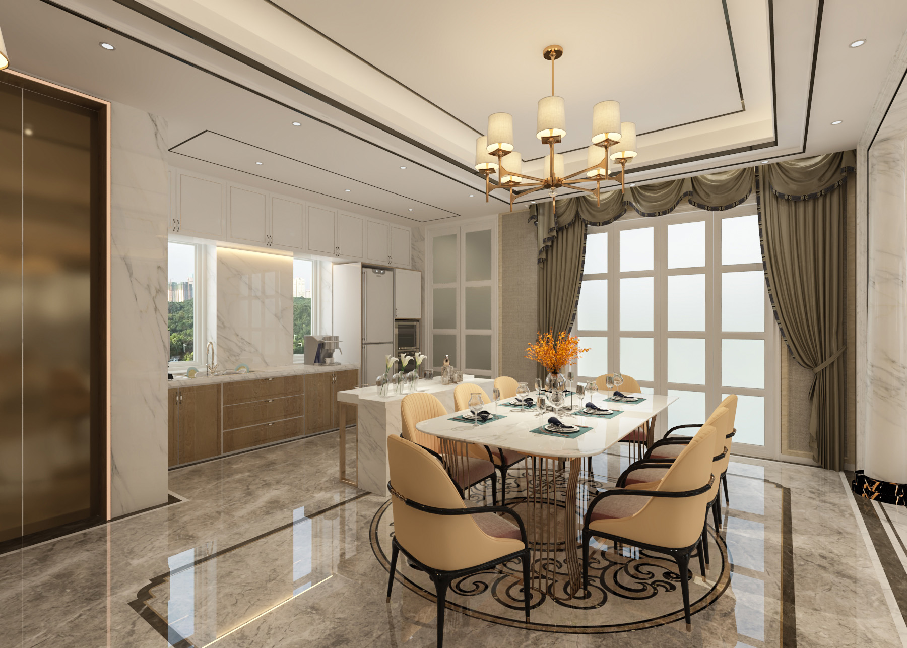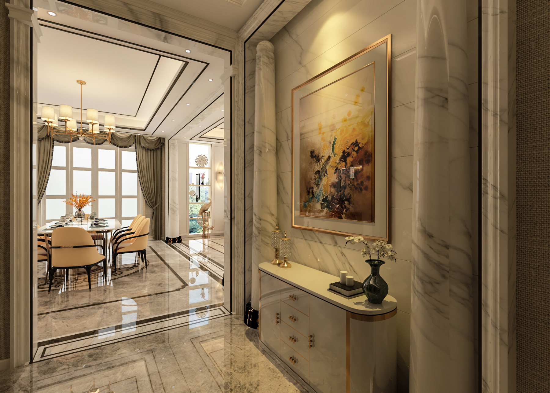 簡歐帶著一點(diǎn)輕奢的感覺,整個(gè)公共空間線條硬朗,材質(zhì)感比較強(qiáng),私密空間一溫馨舒適為主。
