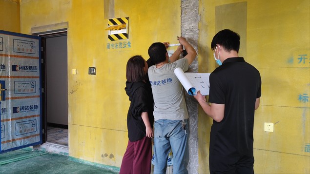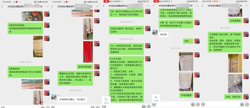 客戶、設(shè)計師、管家及水電師傅,現(xiàn)場確定水電位置,管家以文字加圖片形式發(fā)送至微信服務(wù)群,告知客戶今天交底的內(nèi)容,待客戶確認后方可施工。